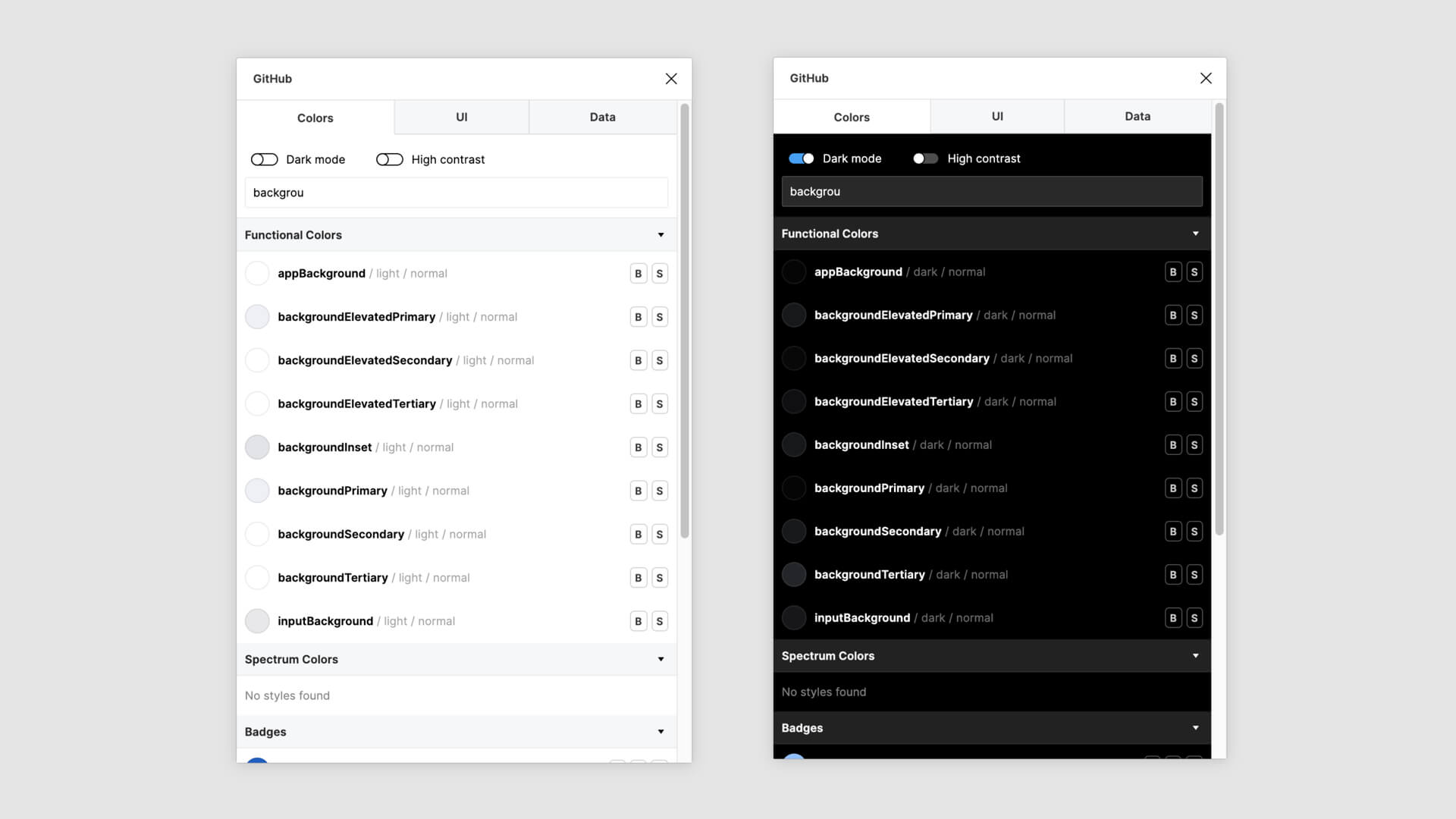 We knew we wanted to ship our mobile apps with dark mode support out of the gate. This meant that we needed to extend the Primer color system to account for dark mode variants. The next utility plugin took the original set of Primer styles and extended them into a mobile-only "spectrum color set" that contained dark mode variants.