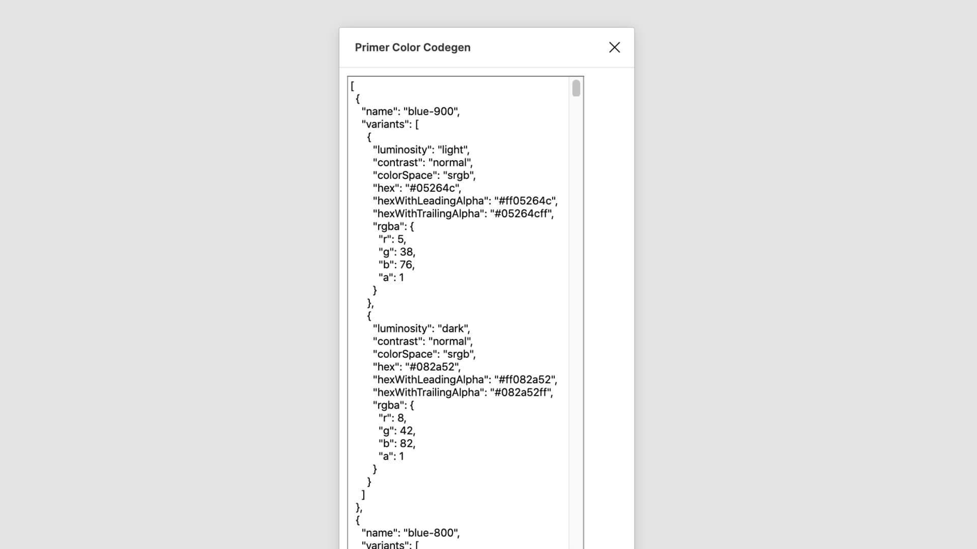 The next plugin grabbed all the color swatches from a Colors page and generated an array of color objects, each with useful metadata like mode (light or dark, high contrast or normal contrast), hex values, and even extended hex values with alpha (for Android).