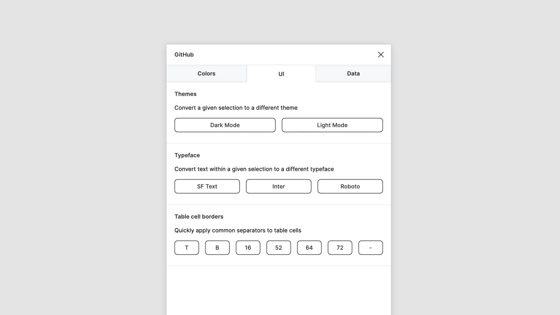 You can grab the figma-github-data plugin on GitHub to see how it works, or fork it for your own team. The Figma Plugins API docs are solid, and should be your go-to resource as you're building your plugins.