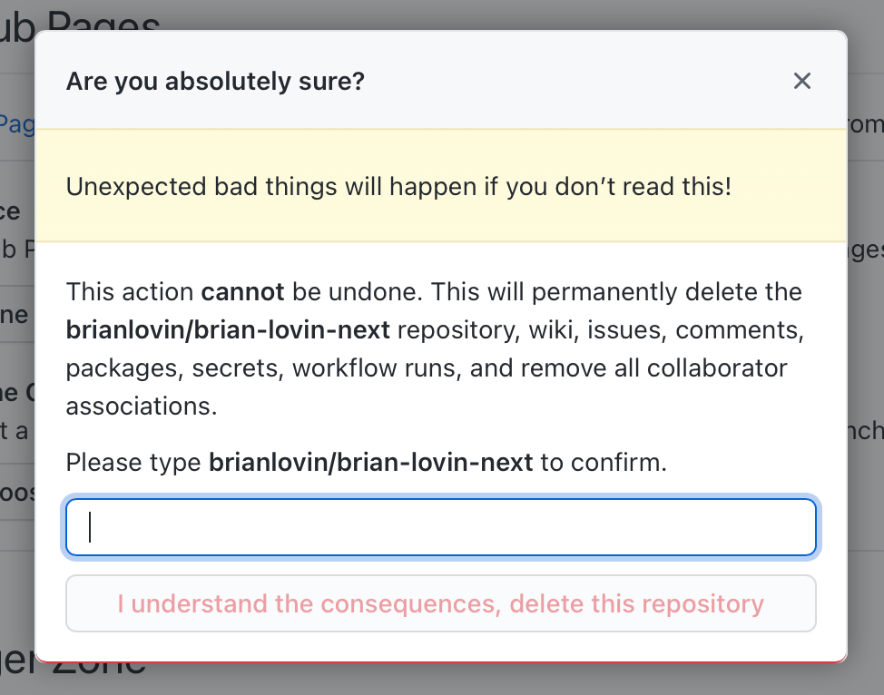 Some apps take this even further by requiring users to type specific strings, like the name of the thing they are deleting, as an even more strict confirmation flow. Here's GitHub's repository deletion prompt:
