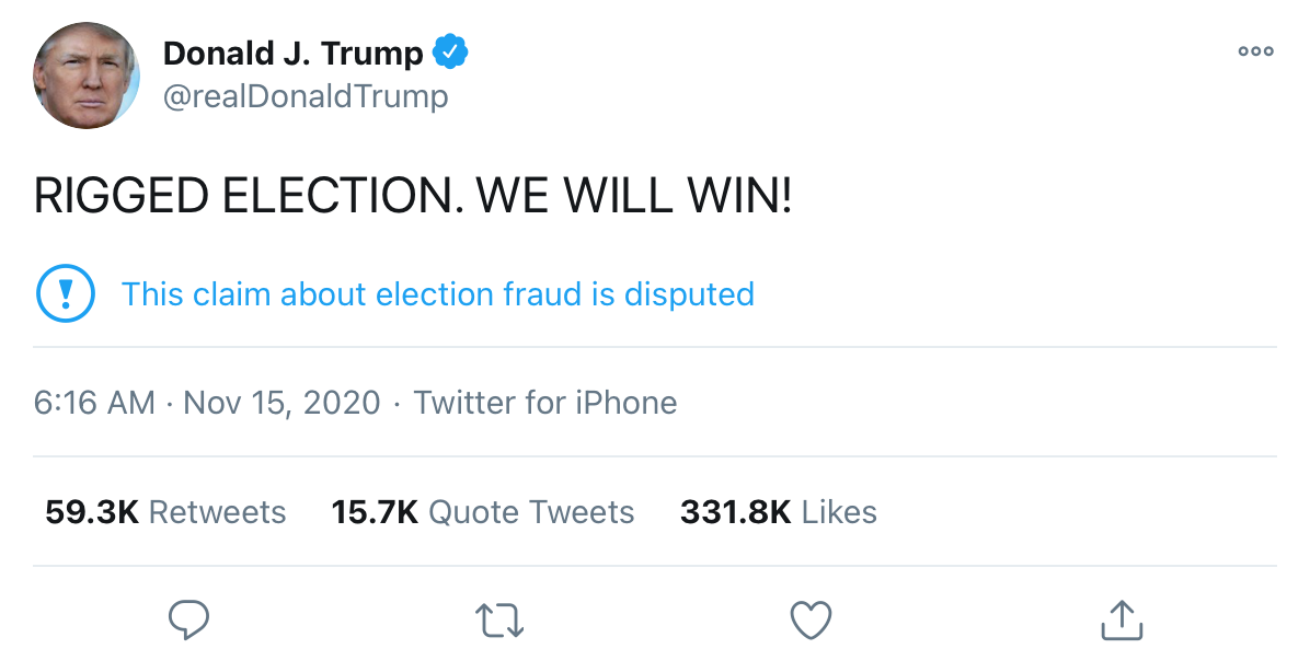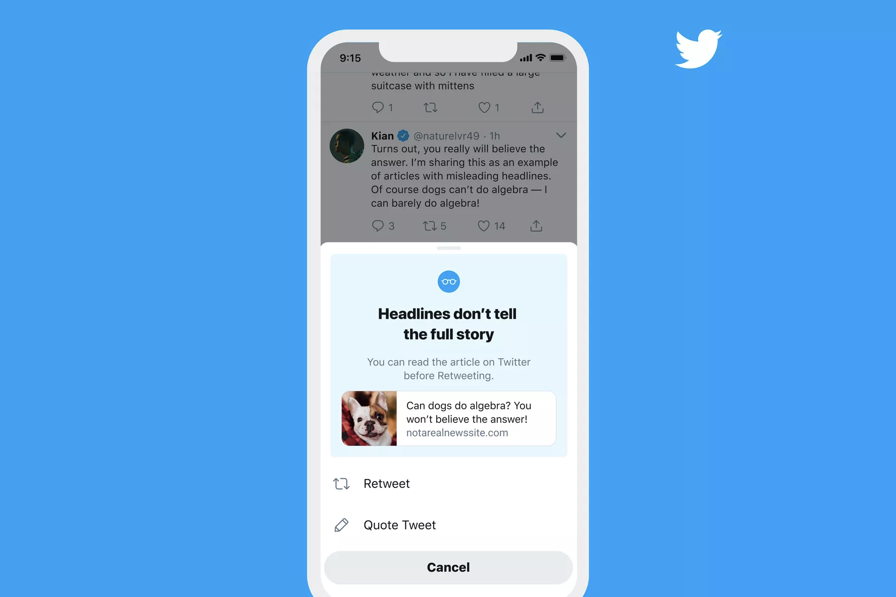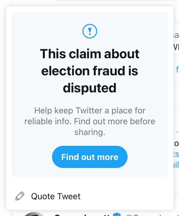 Twitter does both – not only does a flagged tweet have a contextual link to learn more, but if you click on the retweet button, they show a popover warning that the underlying claim is disputed.