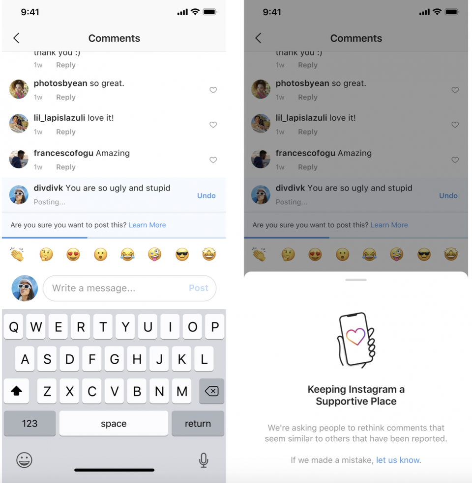 Instagram has a feature that warns users when they are about to leave toxic comments on a post. This prompt might help people to calm down if they were leaving a comment in the heat of a moment. More generally, prompts like this remind people that there is another human on the other side of that screen, and that our words matter.