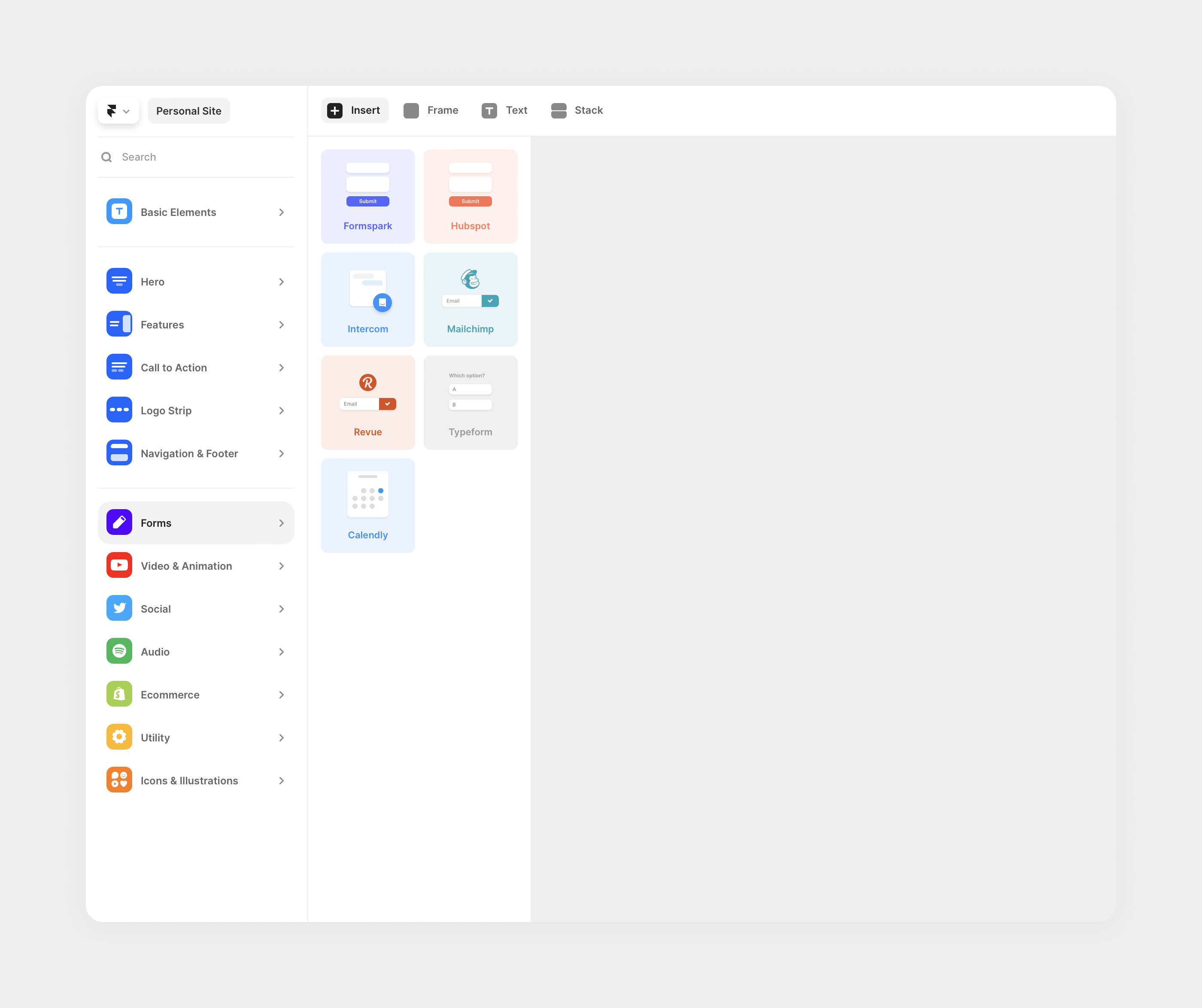 Components and integrations — while I didn't get a chance to play with these during the live stream, I poked at the Insert menu after the fact to discover ready-made components for forms, social media posts, and common page components (like navigation bars and footers). How cool is that? In my design tool I can drop in a fully functioning form for an email newsletter, or I can simply paste a URL to render a dynamic tweet directly on my page. These are the kinds of "hacked-on" things that you might hope to see in a Figma plugin, but come baked directly into Framer's component system.