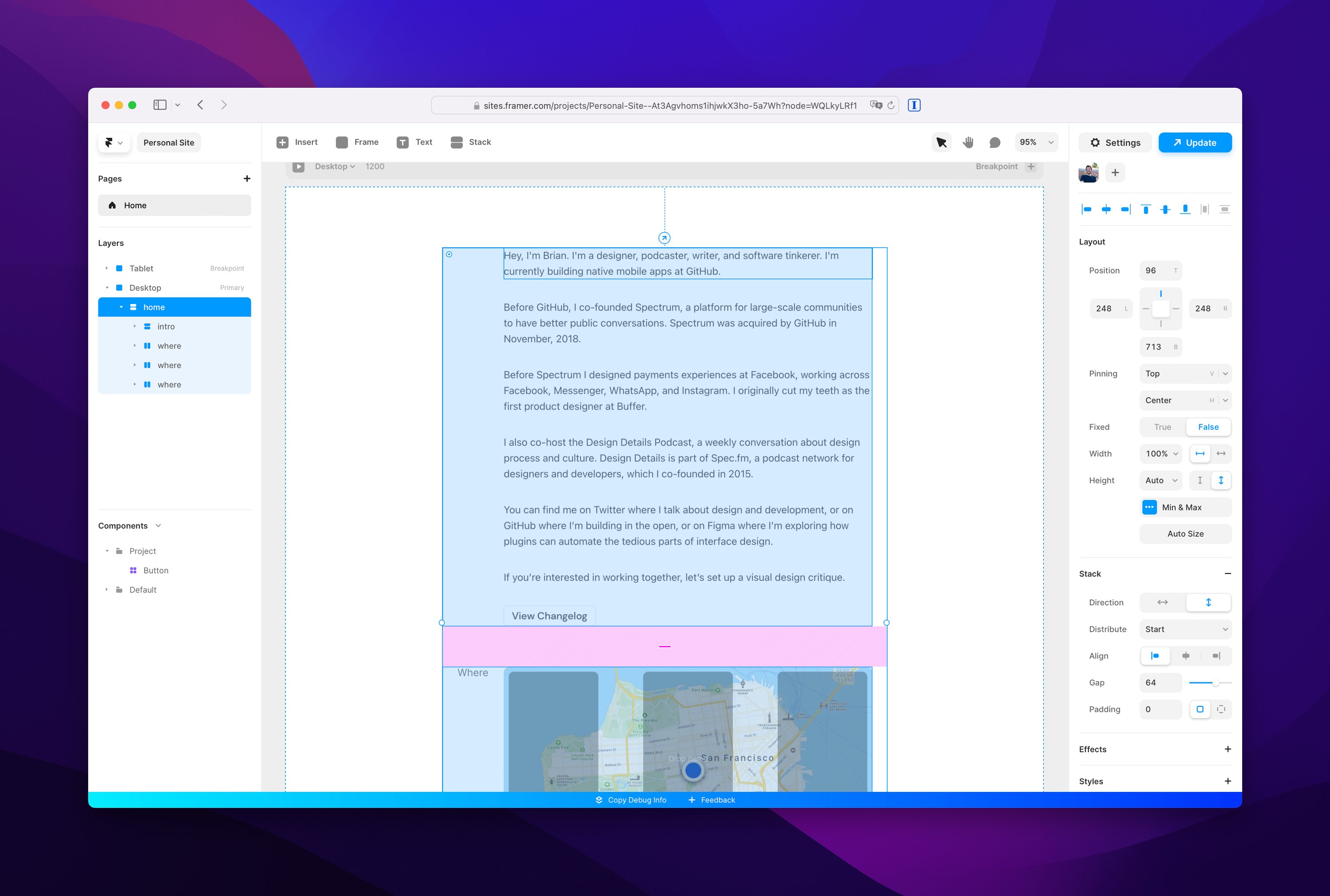 It was a really fun hour of learning and building, especially because many people on the Framer team were in the stream to answer questions and guide me when I got stuck. After one hour, I had nearly recreated the home page of my personal website and deployed it instantly with a click.