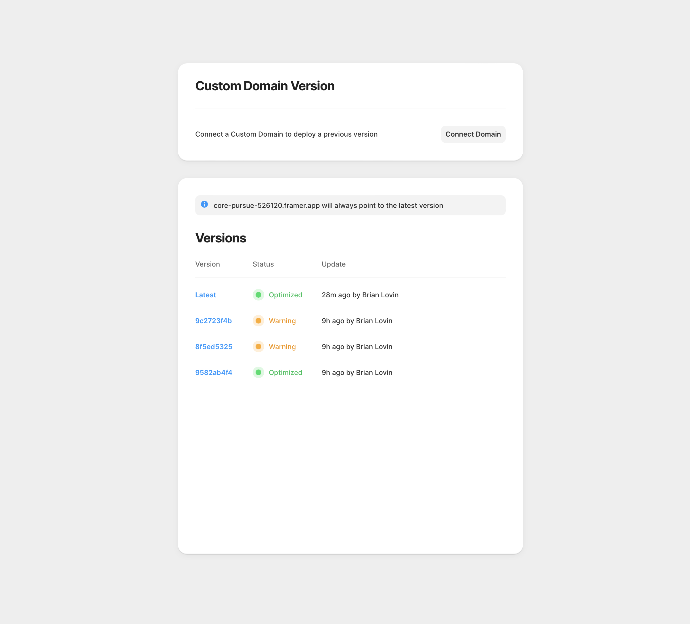 This does make me wonder, however: what's the story for teams on Framer Sites? Maybe this is on the roadmap, and first things have to come first. But it's pretty wild that I can totally break my site and click publish without any kind of system (as far as I can tell) for testing, previewing, or approving changes.